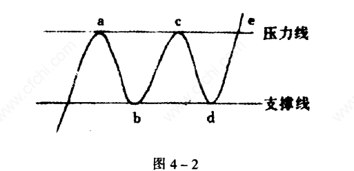 观察图4-2中的矩形股价运动形态:上升的股价首先在a点受阻回落,达b点时停止下滑,并再次上升达c点,在c点再次受阻跌至d点,又再度上升。当连接a点和c点、连接b点和d点后,就形成两条直线,这两条线分别称为压力线和支撑线。