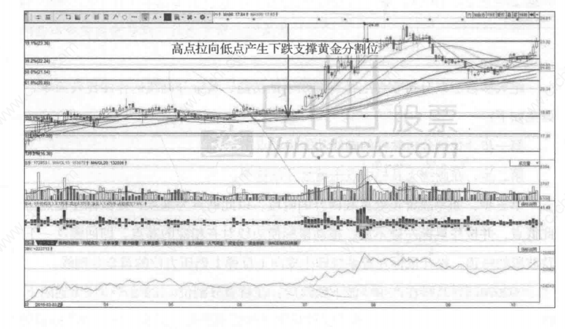 如果股价回调到0.5线附近时,就又重新返身向上,则说明股价的上升行情并未结束。当股价向下击穿0.5线这条重要支撑线后,该段上升行情高度的0.618线就是最后一个支撑位。