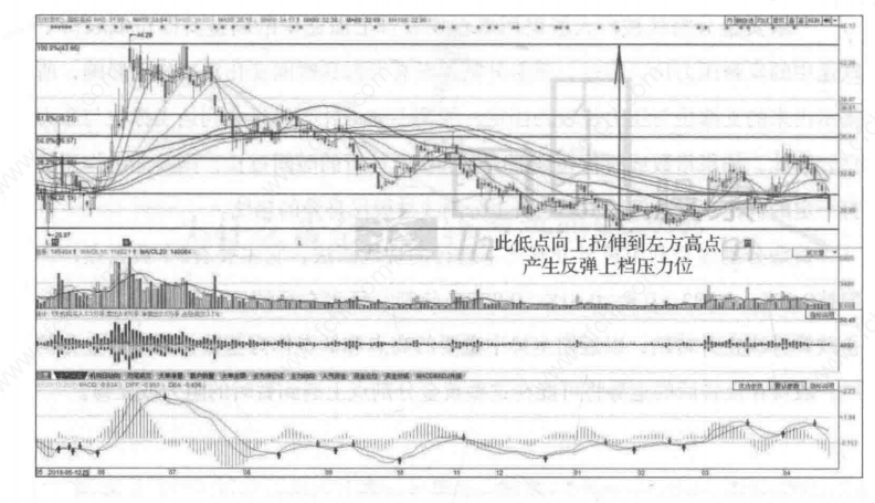 当股价从高位下跌过程中,由于前期跌势过勐,股价会有一个比较大的反弹。当这种反弹高度未到0.382线处,就又重新下跌,则意味着这种反弹是弱势反弹,股价未来的跌势可能会更加凶勐。