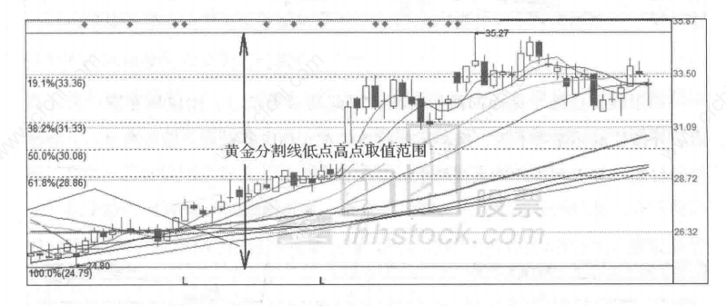 在黄金分割线的实际运用时,有若干个特殊数字0.191、0.382、0.50 、0.618、0.809、1.00、1.618、2.236、2.854,其中0.382,0.618,1.382,1.618最为重要,价格极为容易在由这四个数产生的黄金分割线处产生支撑和压力。
