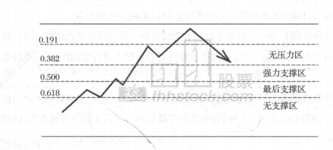 在一轮比较大级别的下跌行情中,股票运行态势按黄金分割标准划分,自上而下可分为四个区域,即无支撑区、强压力区、最后压力区和无压力区等。