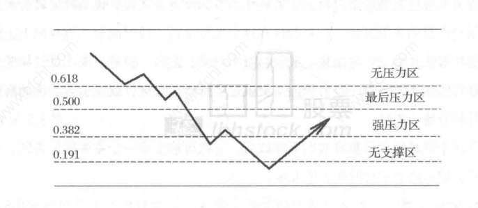1.无支撑区。下跌行情中的无支撑区,是指股价在上跌过程中的0.382这条黄金分割线以下的区域。在一轮大的下跌行情里,股价一般都会出现几次比较大的反弹走势,而在这种向上反弹过程中,只要股价始终运行在0.382这条线黄金分割线以下的区域时,股票的下降趋势就会持续下去。