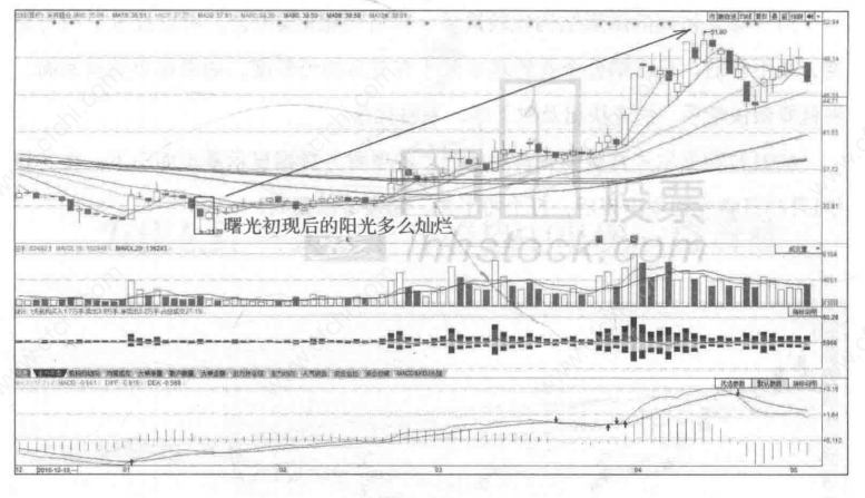 曙光初现形态预示着跌势已尽,市况将要反转,市场一边倒的现象即将结束,就像是漫漫长夜之后,天边终于泛出了鱼肚白,清晨的第一缕曙光燃起了人们对一天的希望。