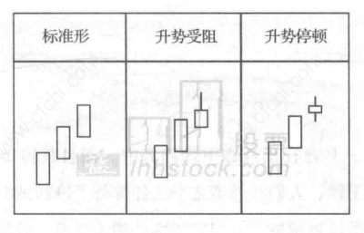 这三种K线组合出现时,标准形是最强势型,后两种则稍微弱一点,但是后势看涨的情况基本相同。