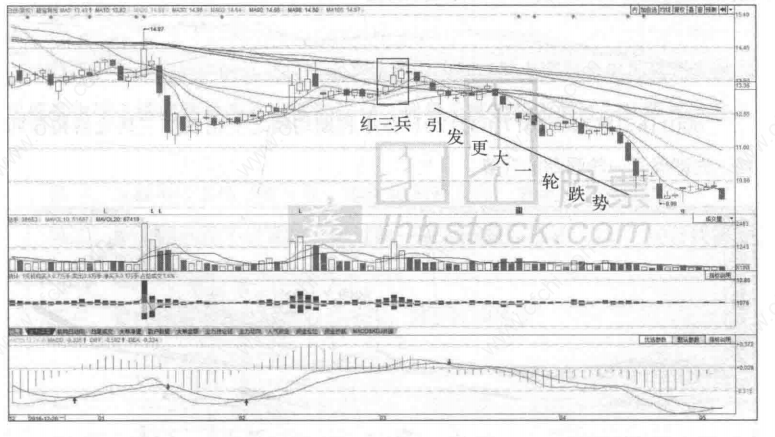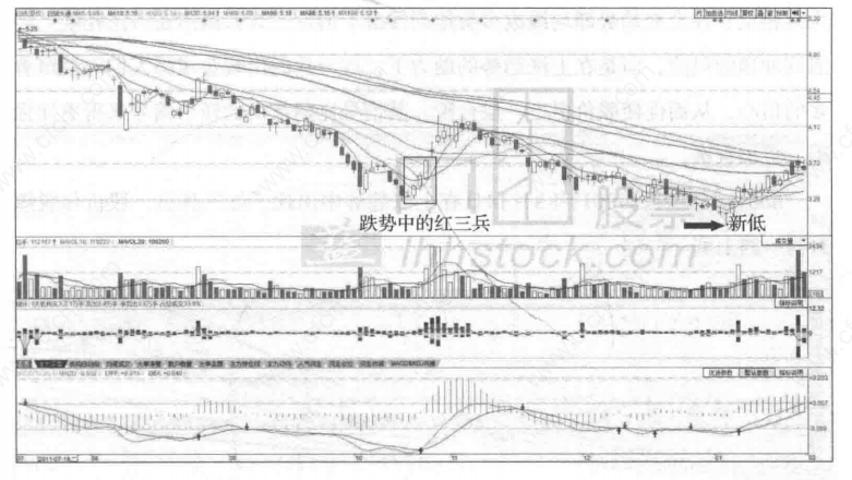 此时,人们松了口气,跌势终于要到头了。但是,由于对前面的跌势人们还心有余悸,不敢追高,所以股价还是会缓缓地回落。正如前面600400红豆股份截图中的第一个红三兵之后,股价缓缓回落,甚至有时股价还要继续创新低。更有甚者跌势中的红三兵引发了更大一轮的跌势。