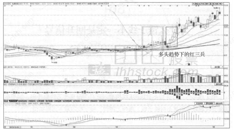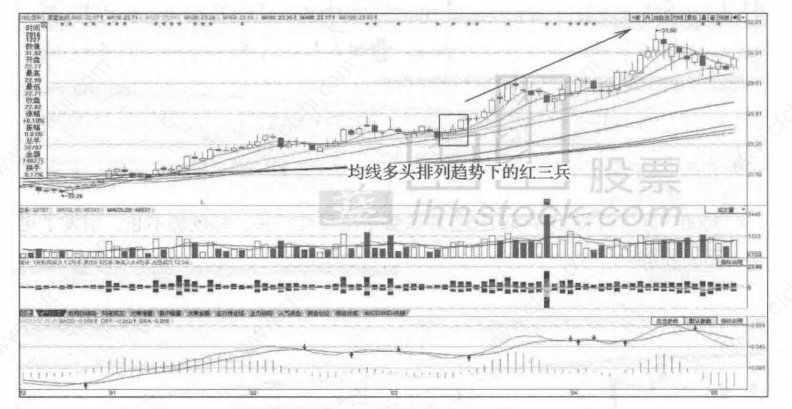 相反,在上涨趋势即均线成多头排列情况下的红三兵,虽然在一定程度上会遇到冲顶的风险,但是在上涨趋势的助力下,红三兵的出现会增强人们对后市看多的信心,从而促使股价更上一层台阶。其信号比弱市中的转市信号来得更加强烈,更加直接。