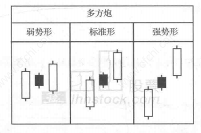 多方炮是由三根K线组成,一边一根中阳线,中间一根小阴线,即二阳夹一阴形成上攻态势,故称为多方炮,预示着多方即将开炮,股价即将上涨。具体形态如图:
