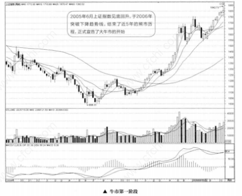 牛市第一阶段及其特点。经过长期下跌和无数次反弹天折的打击,大部分投资者对市场心灰意冷,即使市场出现好消息并开始微量上涨,也成为很多人抛售股票的机会。只有少数的投资者通过经济形势、市场技术面的敏锐观察和分析,发觉市场情况正发生微妙的变化、下跌趋势可能即将终结,于是开始分批建仓。