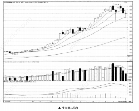 牛市第二阶段及其特点。市场技术面上已经脱离下跌趋势的影响,但大部分投资者仍旧心态犹豫、对行情的运行前景没有明确的方向感,操作上不敢重仓持有,只是做短线交易来搏取微利。市场上已经有领涨的板块和龙头品种,但是长期熊市造成的心理阴影,让大部分投资者不敢触碰这类涨得多的股票。
