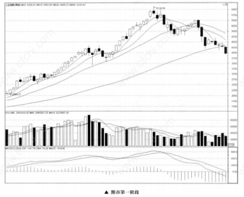 熊市第一阶段及其特点。 因为处于牛市的末期,市场投资气氛可用狂热来形容,投资者对后市绝对乐观。而少数理智的投资者和主力机构已经在悄然撤离。反映在市场盘面上,则股价每一波上涨峰顶时都有巨额成交量,但下跌时,成交量相对缩小。