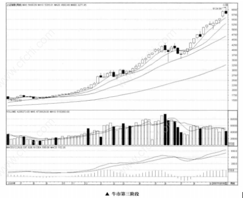 牛市第三阶段及其特点。随着市场成交的不断活跃,成交量不断增加、证券价格的持续、大幅上扬,投资者大多重仓交易,越来越多的投资人和新资金涌进市场。市场的每次回调,都吸引更多的投资人,市场对利空消息无动于衷,看空的声音很快就会被淹没在狂热的买进情绪里。