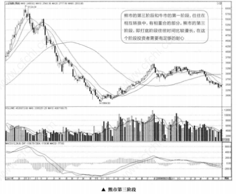 熊市第三阶段及其特点。在这个阶段,市场弥漫着最悲观气氛,股价一再下跌后,大部分投资者已经丧失信心,交易行为大幅减少。股价的下跌已由前期的暴跌转化为阴跌,前期抗跌的板块或是个股开始出现补跌。于是牛熊相互转换的契机再度临近。