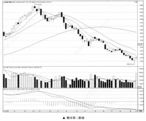 如下第一张图所示,熊市第二阶段及其特点。这一阶段技术面上已经脱离了上涨趋势,但仍有较多的投资者不愿意相信熊市已然来临,更不愿意抛售手中高价股票。在一轮股价急跌之后,投资者相信底部已经出现,进场抢反弹的机会到了或是为了尽快解套而加仓。一轮反弹适时发生,但反弹的过程中,很多投资者发现虽然大盘指数上涨,但自己手中的股票却很难获利。