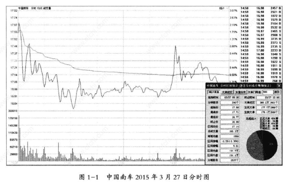 图1-1为“一带一路”概念股停盘前2015年3月27日中国南车的分时图,图中,大单买卖比例高达 90%,小单只有6%。说明中国南车由强庄在控盘。