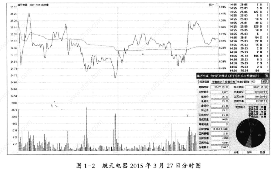 图1-2为2015年3月27日航天电器的分时图,图中,大单买卖比例只有15%,小单高达82%。说明这是一只弱庄股,或是一只经过周密伪装的强庄股,庄家的性质有待通过其他指标研判。