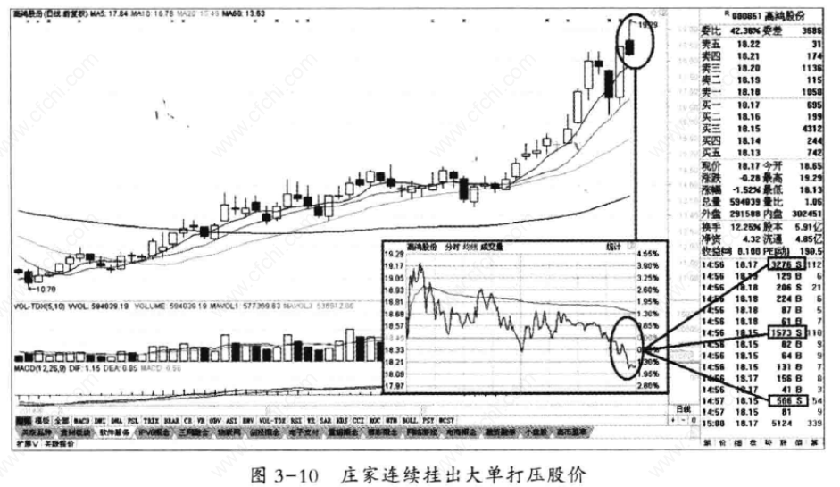 图3-10为2015年3月30日高鸿股份的K线图,庄家在尾盘处连续挂出大卖单,打压股价。这一举动说明,庄家的建仓仍在继续。