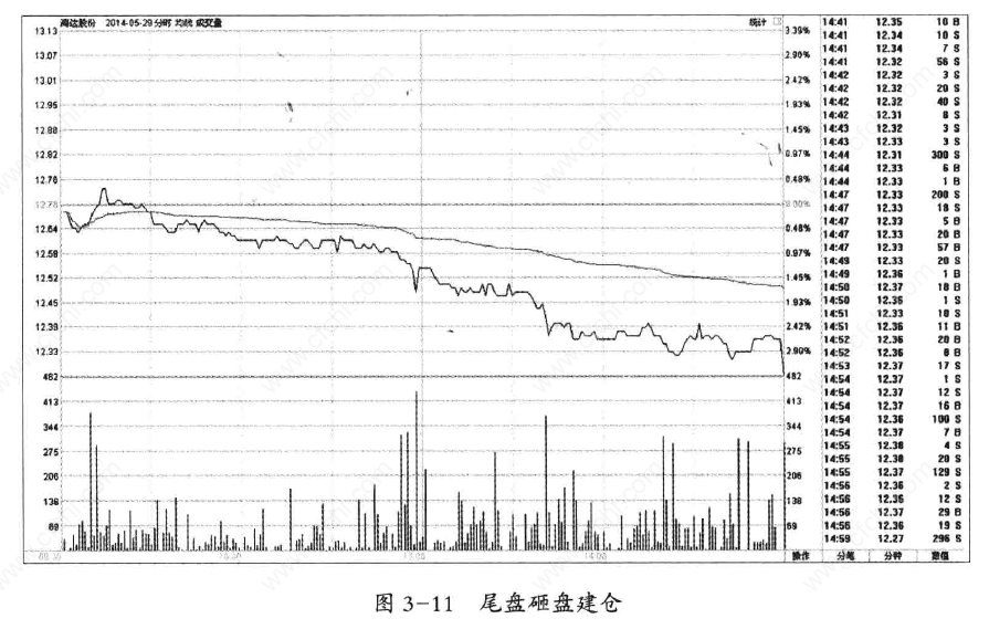 在尾市收盘前几分钟,盘口突然出现一笔大卖单或几笔卖单,庄家降低很大价位抛出,使股价在收盘前瞬间被砸到低位。在分时图上,股价通常在急跌三四个点之后在低位横盘震荡,集中了主要的成交量。