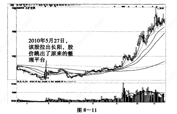由此可以看出,主力此前拉出的那根大阳线实属试盘行为。该股从6月23日后又开始了一段整理行情,在9月8日又拉出了一根长阳线之后,才开始了一波真正的上涨行情。如图8—11所示: