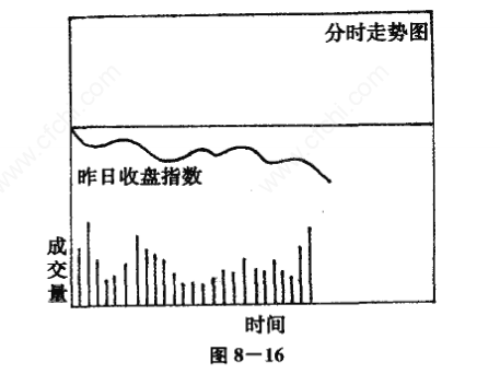 5.如图8一16,主力根据盘中价量关系变化了解到散户急于出脱持股,追高意愿弱,盘面表现为价涨量缩、价跌量增的背离走势,且价位始终在前一交易日收市价以下波动,盘势极弱无疑。