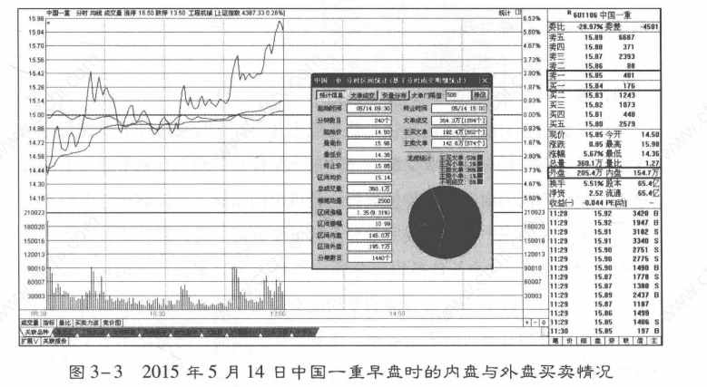 图3-3为2015年5月14日中国一重早盘时的内盘与外盘买卖情况,显示买入踊跃,故股价被不停地拉高。