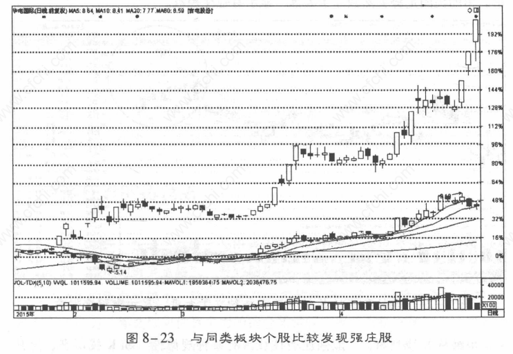 在目前的市场中,板块联动是较为明显的一个规律,常常表现为荠涨齐跌。而较强的庄家介入的个股,在大部分基本条件相差不大的条件下,则会在走势上强于同类板块中的个股(图8-23)。