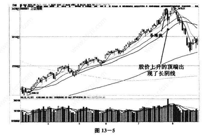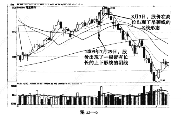 但8月4日,大盘也出了一根在顶端的T字线,这种信号也属于典型的卖出信号。此形态出现后,指数开始一路下跌,浦发银行(600000)的股价也开始下跌。如图13--5、13一6所示: