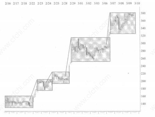 要通过立体走势图来减少动量操作的危险。分析在自己所关注的时间段里,可以获得哪些回报。要确认股票没有出现离散现象,即某个行情即将结束,或立刻发生反转的可能性。然后,根据次一级时间段的走势图来指导交易和仓位管理。当强劲走势在日线图上爆发时,利用60分钟走势图来确定低风险入场的机会,并确定合理的离场价位。对于日内操作,可以通过1分钟走势图来确定波动幅度,以控制5分钟价格线的突破。