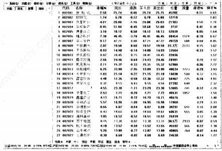 进入交易系统后可以看到界面中列出了若干只股票在当天的一-些信息.如涨幅、现价、涨跌、总量等,如图所示。在界面的下方有一些可以选择股票板块的标签,如果我们想看中小板的股票,则可以单击下方的“中小”标签。