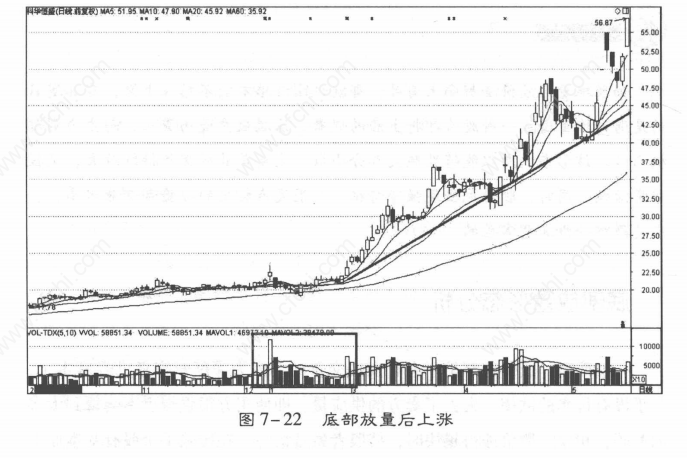 二是当市场下跌到一定程度后,由于政策利好等因素激发了市场人气,由此引发了底部放量后的上涨(图7-22)。