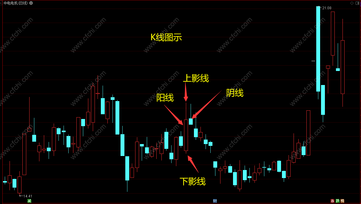 K线图,也被称之为蜡烛图,用于记录股市的行情与价格波动。如果当天的收盘价高于开盘价,则收盘价在上,开盘价在下,两者之间的实体以红色绘制,称为阳线,代表股价上涨。反之,开盘价在上,收盘价在下,两者之间的实体以绿色绘制,称为阴线,代表股价下跌。