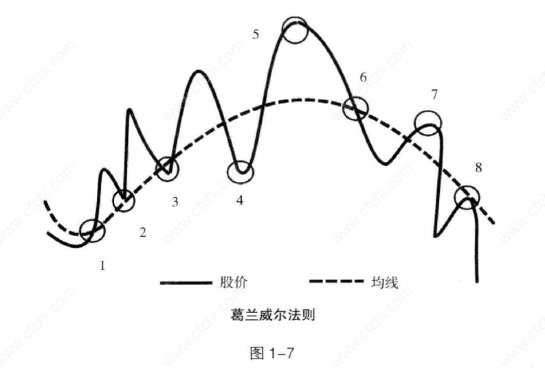 葛兰威尔法则中,前四条法则是买入法则,后四条法则是卖出法则。如图1-7所示。