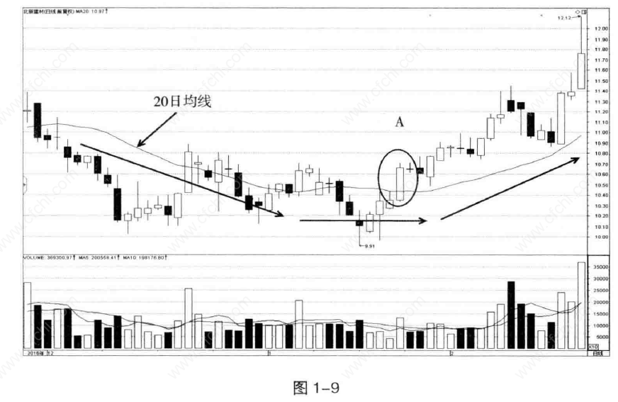 如图1-9中的20日均线,从下行到走平再到上升,A点股价向上突破的技术含义,就不是短期均线可以与之相比的。后市只要20日均线继续保持上行,股价运行重心也基本保持同向运行时,就不必过分担心趋向有太大的变化。