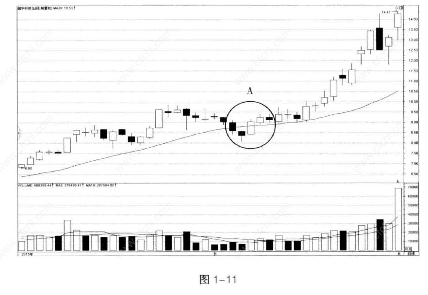 当股价向下跌破均线时,并不必然说明支撑已经不存在。如图1-11中A点所示,股价破掉均线,但很快又重新回到均线之上,均线并没有对股价形成压制,就说明支撑依然存在。