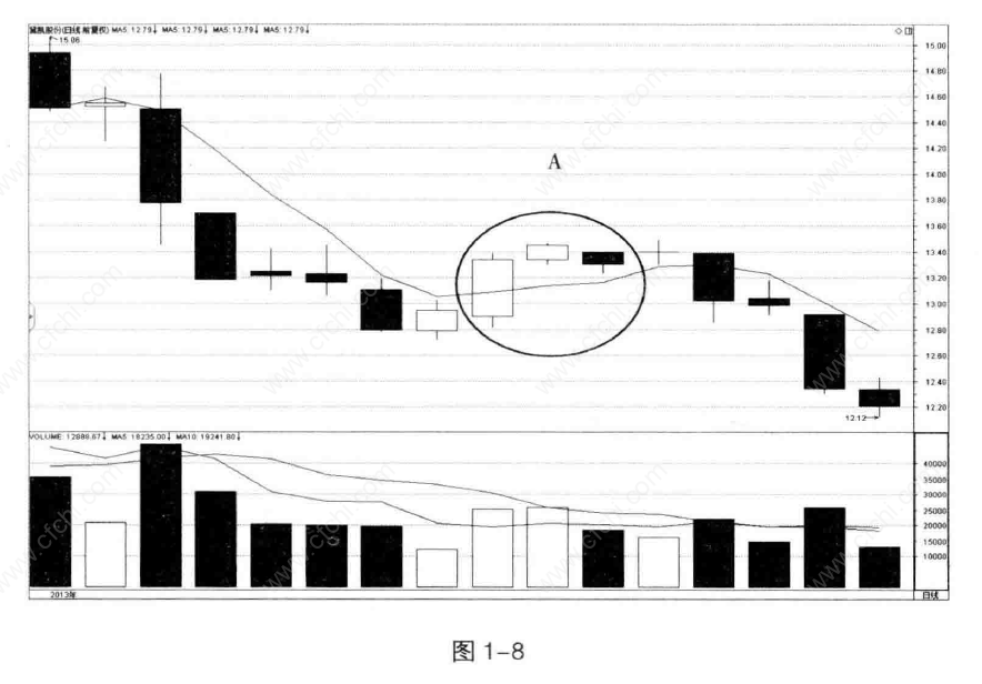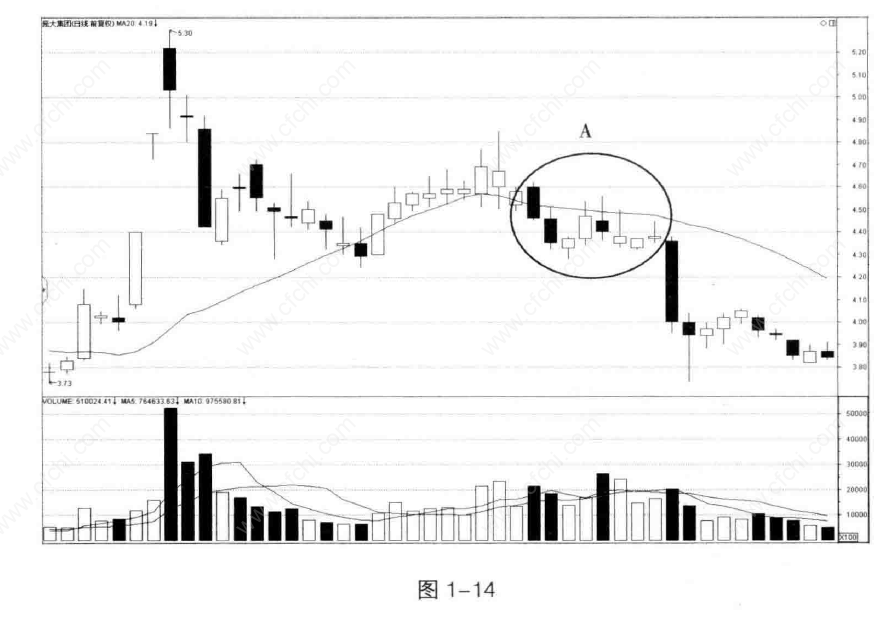 如图1-14所示,在均线上行阶段,股价回落后得到支撑,依附均线盘升。至A点时,股价跌破均线,此时均线也已经从上行态势转为下行。之后股价试图收复均线,但明显遭遇到较强的压制,最终股价还是选择向下跌落。