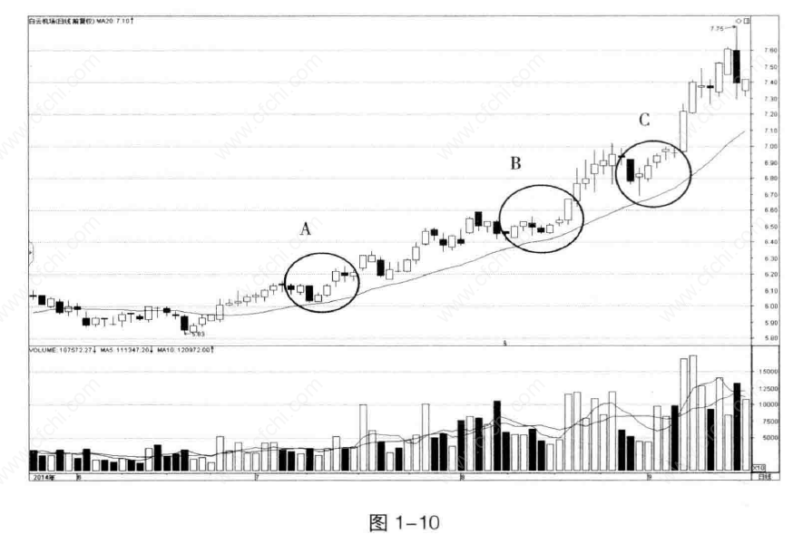 如图1-10所示,A点股价触及均线后便回升,至B点时,多日的回落却连均线也未触及就开始回升,这说明股价可能已经进入到滑行阶段。
