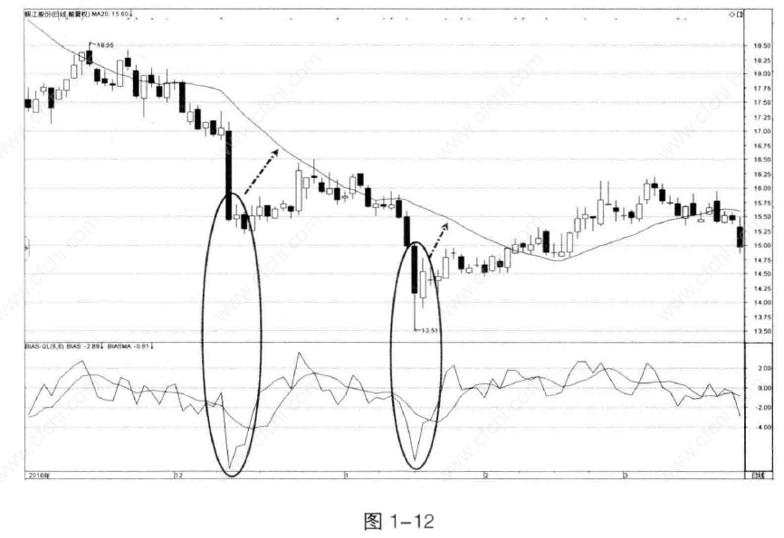 如图1-12中标示的,股价快速下跌,导致与均线之间的乖离率增大,随后股价反弹。图中所示下跌趋势中的买进,应是一个短线交易行为,因为股价的反弹可能仅仅是为了修复过大的乖离,完成任务后很有可能会继续下跌。技术环境不同,交易预期也必然有别,这一点必须注意。