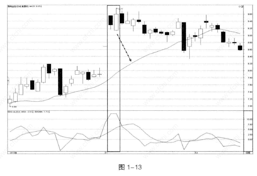 如图1-13所示,股价短期暴涨远离平均成本线,下方乖离率指标也随之大幅走高,股价随后便转入下跌。股价向上大幅逃离均线,持仓者短期盈利必然迅速增加,此时极有可能诱发兑现欲望,进而导致股价出现回落。