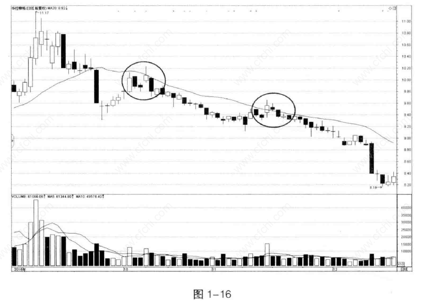 如图1-16所示,股价、均线同步下行,下行一段时间,随着乖离率的加大,股价以弱势反弹来修复过大的乖离,触及上方的均线后便再次败退。