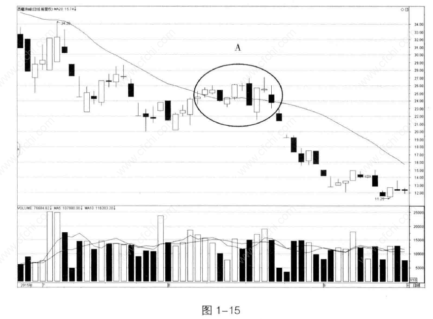 如图1-15所示,股价与均线同向下行,至A点股价反弹,但均线仍旧维持下行态势,这种情况昭示出股价反弹难以持久。