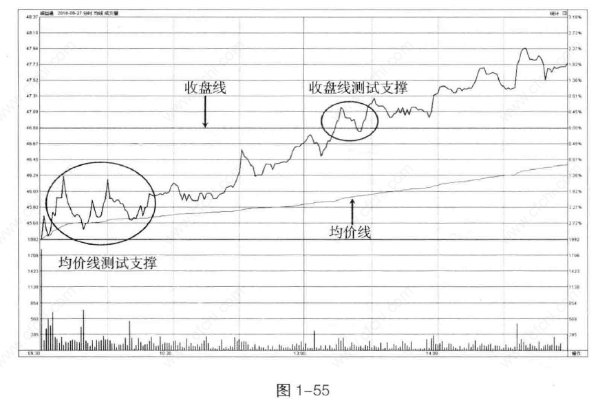 股价上扬至收盘线时,如果收盘线没有形成压力,则说明股价处于强势状态,上涨仍将延续。股价突破收盘线后,除非直线拉升的强势股票,一般都有回探收盘线确认支撑的动作,确认收盘线得到支撑,股价将进一步扬升。如图1-55所示。