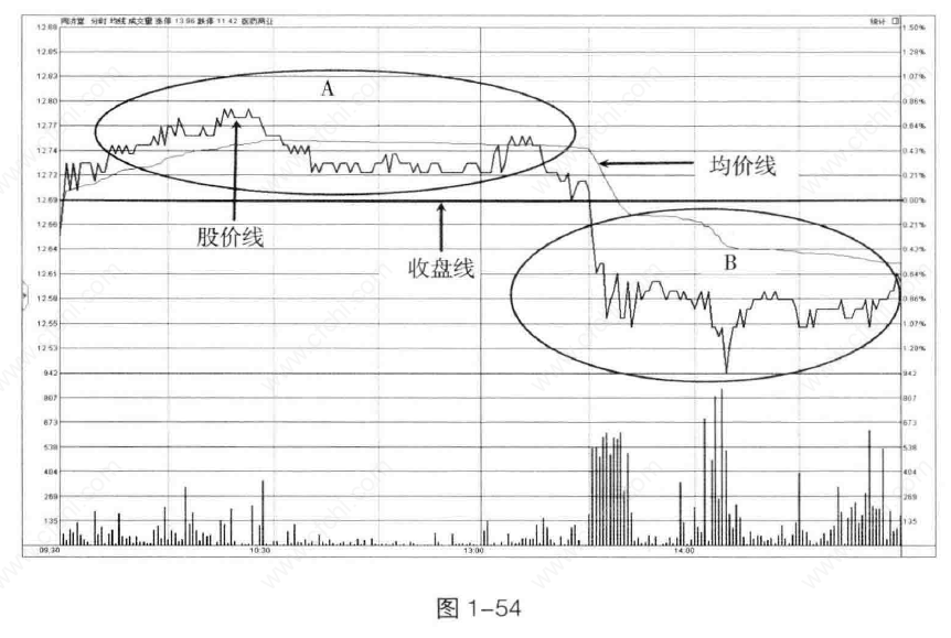 当股价持续在收盘线、均价线下方运行时,表明市场预期较差,很多人正在陆续卖出,当天介入的大部分交易者都亏损(见图1-54中B点)。