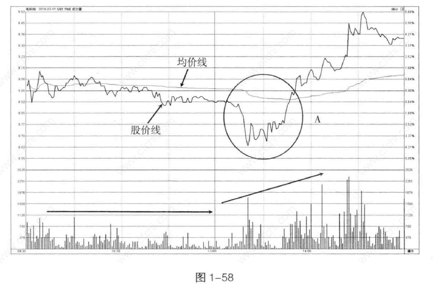 如图1-58所示,A点股价和均价线之间乖离过大,股价虽然下跌,但均价线已经出现走平,显示盘中跟风杀跌意愿已经减弱。之后股价跃上均价线展开反弹。