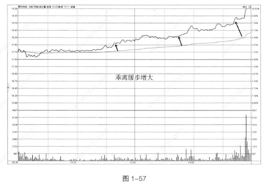 通常情况下,股价匀速上涨,均价线紧密跟随,乖离呈缓步增大的状态,则股价后市保持强势状态的可能性较大。如图1-57所示。
