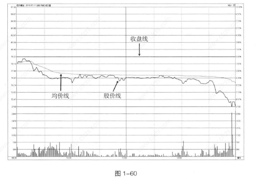 如图1-60所示,该股低开后无力突破收盘线的压制,随之回落至均价线和收盘线以下,显示股价处于弱势形态。