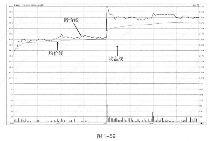 如图1-59所示,该股开盘后迅速收复均价线和收盘线,之后在均价线和收盘线的支撑下小幅波动,午后股价迅速拉升。