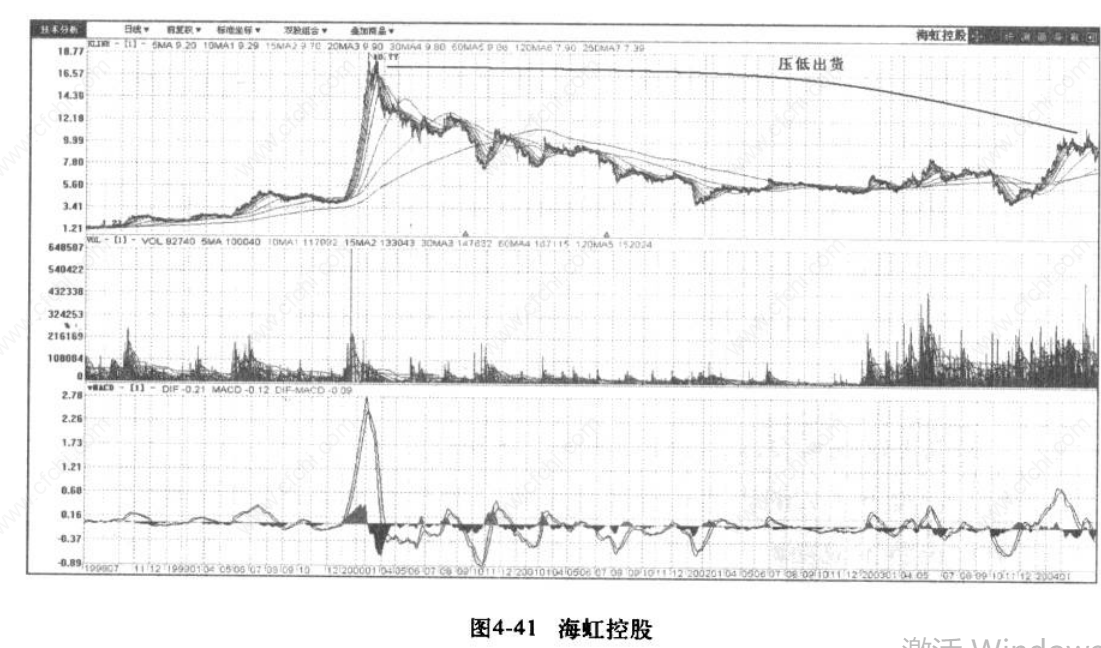 还有一些比较现实的庄家,出于急迫的兑现心理,在对敲护盘的同时也会不断地压低价格进行逐步派发。我觉得这类庄家的做法还是比较聪明的。