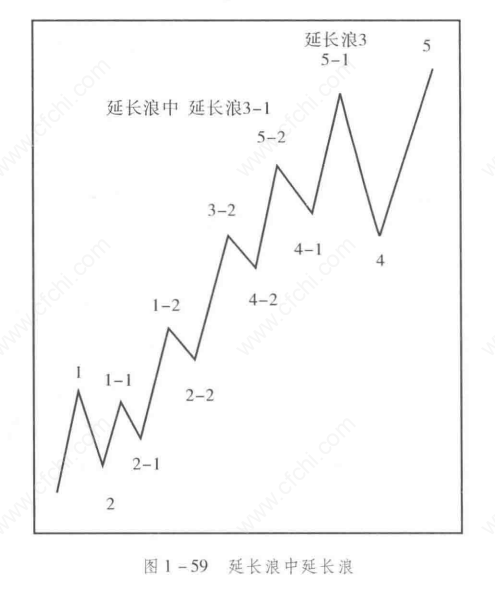 延长浪中延长浪也就是一个五浪上涨结构中有13浪,见图1-59所示,如小浪级一波五浪上涨结构1、2、3、4、5浪;其中小浪3是延长浪,分解成小浪级的1-1、2-1、3- 1 、4-1、5-1浪;其中小浪3-1也是延长浪,再分解成小浪级的1-2、2-2、3-2、4-2、5-2浪。