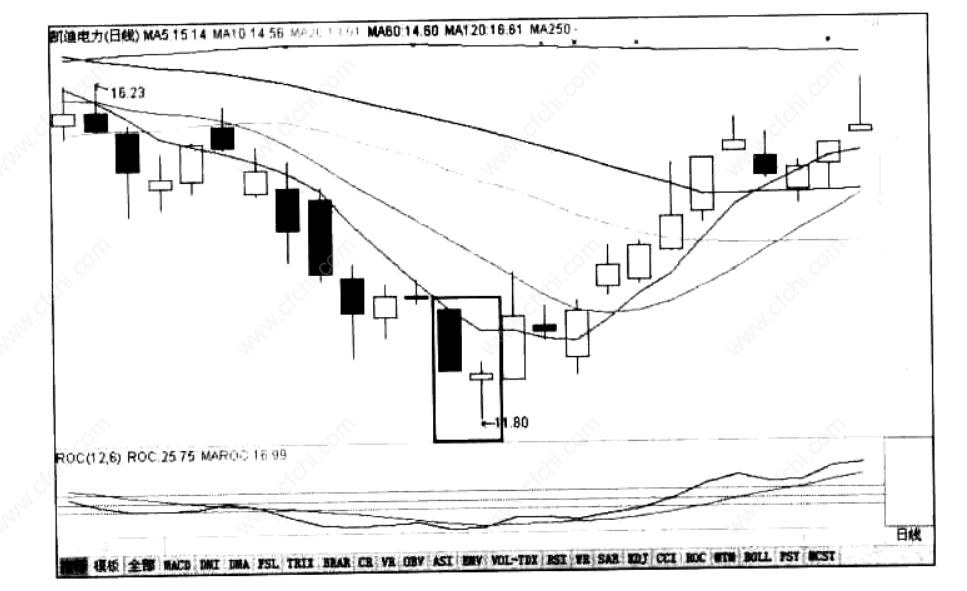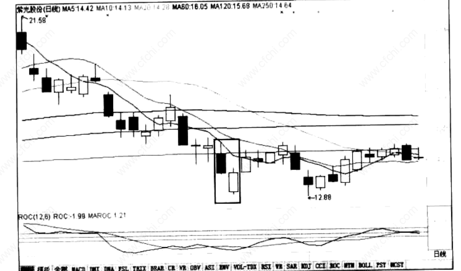 股市经过大幅下跌,且在下跌过程中没有出现明显的反弹。后一天的开盘价低于前一天的收盘价,但在收盘时与前--天的收盘价相同。紫光股份的K线走势图如图1所示。在经过了前期的长期大幅下跌后,出现了反击线的K线组合,随后出现了小幅的反弹行情。凯迪电力的K线走势图如图2所示。在经过了前期的长期大幅下跌后,出现了反击线的K线组合,随后出现了上涨行情。