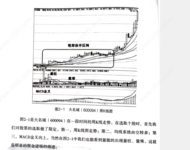 换手率的计算公式为:换手率=成交量+流通盘x 100%。投资者在计算庄家或主力资金从开始建仓到开始拉升时这段时间的换手率时,怎样确认庄家或主力资金开始建仓呢?参考周K线图的K线均线系统由空头转为多头排列,证明有庄家或主力资金介人,周MACD指标金又可认为是庄家或主力资金开始建仓的标志,这是计算换手率的起点。