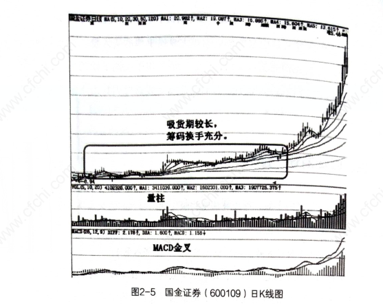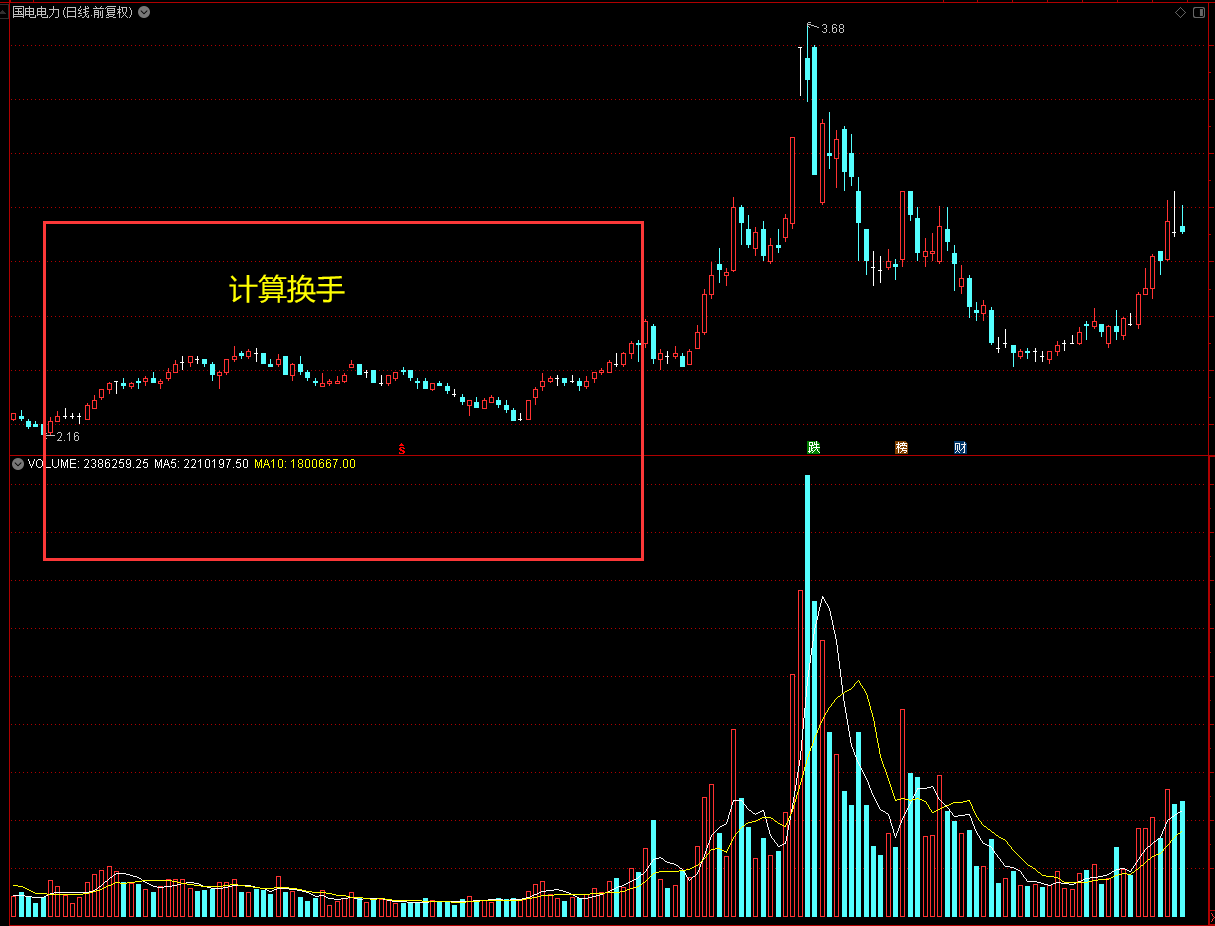 图上是国金证券( 600109 )在一-段时间的K线走势。这只个股在拉升前经过了长达5个月的吸货期。经过这5个月的吸筹,筹码迅速集中,个股集聚了大量的上升动能。在完成吸筹后,个股开始走出上升走势。股价也从最初的9元涨到了高点时的25元。现在我们看主力资金在吸货期完成的换手。